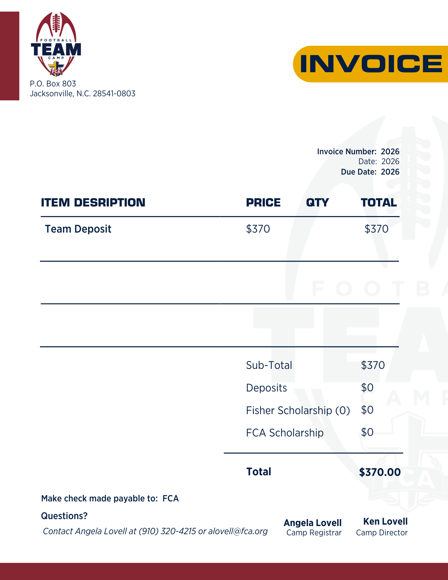- FIRST. You can initially reserve your spot as a TEAM by immediately contacting our Camp Registrar, Angela Lovell, at (910) 320-4215 or by email at alovell@fca.org. We need your best guess numbers of Coaches and Athletes attending (two different numbers) to initially secure your spot.